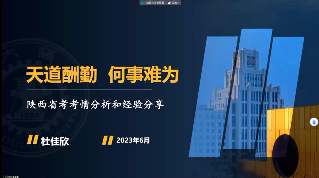 杜佳欣以“天道酬勤,何事难为”为主题,向大家深度剖析了陕西省考的准备经验,内容涵盖基本情况、考情分析、经验分享三大部分。她详细概述了自己准备省考的过程,包括考试流程、笔试面试、考试难度以及备考周期等关键信息。紧接着,杜佳欣着重分享了自己的备考心得。首先,她强调明确目标、坚持职业定位的重要性。对于如何确定目标,她提倡通过政务实习、企业实习等经历在实践中寻找答案,从而破除迷茫,避免自我怀疑。其次,她指出,掌握备考技巧是成功的关键。一方面,对于行测部分,她主张关注解题速度,合理安排题目顺序,适时策略性地放弃部分题目,并巧用“蒙题”技巧。另一方面,对于申论部分,她建议大家广泛阅读《半月谈》《人民日报》等杂志期刊中的文章,通过这种方式积累知识,并发挥出自身的理论优势。最后,她建议大家有效管理时间,尤其是要在找工作和撰写毕业论文两者之间取得平衡。