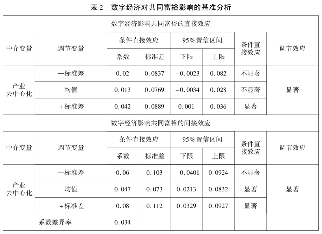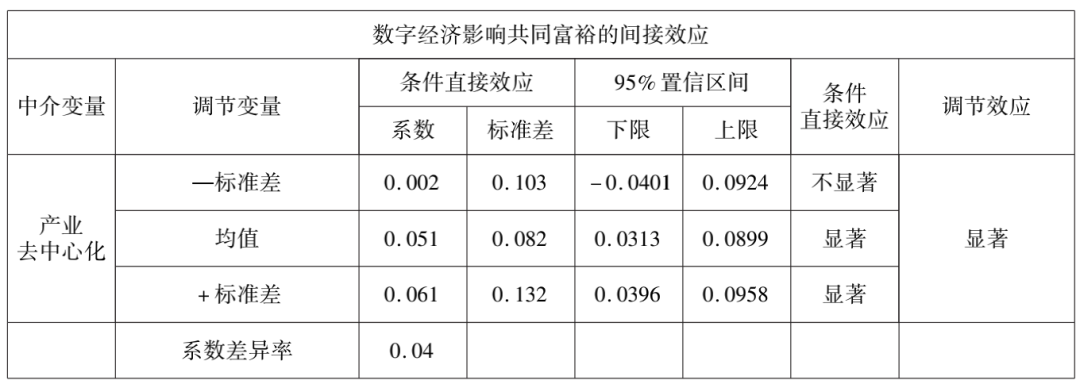 (1)数字经济对地区间共同富裕的影响的直接效应为正但不显著。我们的中介变量为产业去中心化,调节变量为金融支持,根据表2的结果,可以看出,财政支出均值情况下产业去中心化为中介变量的直接效用为0.013,但是显著性检验没有通过,说明数字经济的发展,可以为落后地区提供更广阔的市场和参与分工机会,使得原来不能参与国内和国际分工的地区在数字经济发展的情况下利用电商平台和跨境电商平台,实现销售市场的扩大和价格的提升,最终实现收入水平的提升。但是数字经济的发展还存在层次性,从中国的实践来看,中部地区部分省份利用数字经济发展提升了收入水平,但是西部地区部分省份由于交通运输等条件的限制,还没有能充分享受数字经济的好处,所以数字经济能有效提升部分地区的收入水平,但是对于共同富裕的直接效应还不显著。