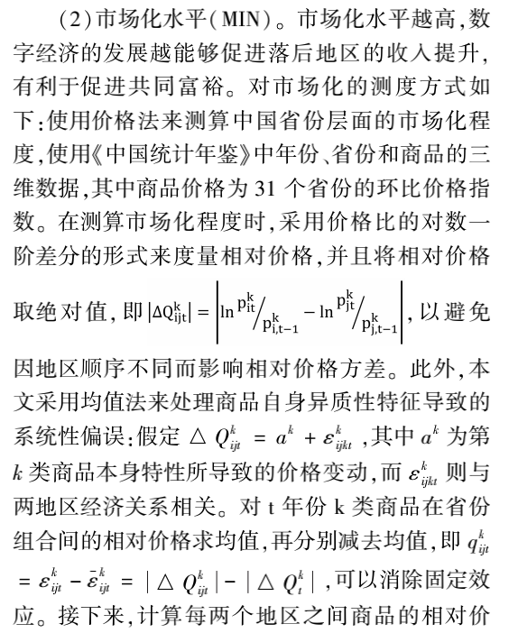 数字经济对共同富裕的直接影响为市场一体化效应。从国内市场角度看,数字经济通过减少市场分割促进市场一体化促进共同富裕。随着中国市场经济的发展,地区之间的分割程度不断降低,区域间经济发展差距扩大而使得区域之间的沟壑部分加大。部分研究表明,改革开放后的中国区域间市场分割程度比以前更大(李善同,2016)[29]。在很多方面,还存在较大程度的市场分割效应,特别是经济发展程度不高的地区,由于竞争效应,对地方政府还存在一定的市场保护政策,限制了国内地区间产业分工的发展,另外对于资源密集的地区,产业结构升级的难度还非常大,形成“资源诅咒”,以前信息不发达,存在较大的信息差,区域内的企业和个体从业者也难以获取足够的市场信息,因而只在封闭区域内竞争。但是随着数字技术的发展,区域产业化可以更加分散,数据和信息可以跨区域流动,产业链在区域内的聚集程度出现下降,产业链开始变得更短,更加分散。特别是数字平台的发展,为产品经营者和消费者之间进行准确匹配。中国地域广阔,不同地域之间的产业结构存在较大的差异。东部沿海地区已经完成了工业化,第二产业占据主导地位,主要面向出口市场。中西部地区虽然地域辽阔,但工业化进程不足,部分地区还以第一产业为主。对于第一产业来说,特别是传统农产品存在市场范围狭小,物流交通不便等制约因素,数字经济的快速发展,使得农产品可以在全国范围内自由流通,为农业生产者减少了信息不对称的问题,增强了生产者信息整合和协作的能力,降低整体经济活动的交易成本、物流成本、技术成本、广告营销成本等,从而提升农业生产者的市场空间,促进农民收入的提升,降低收入差距。