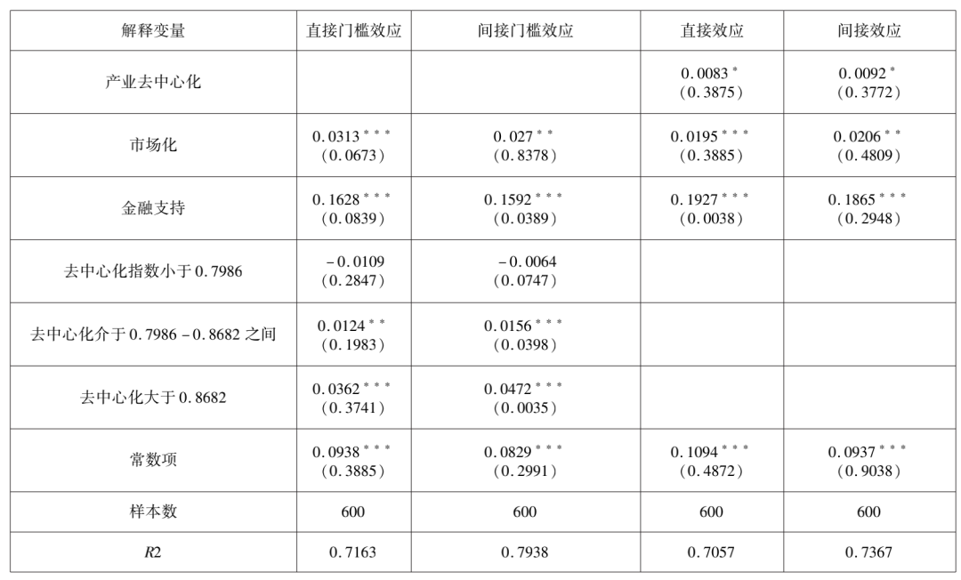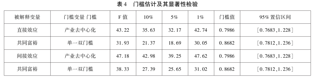 上面的研究发现,数字经济通过去中心化效应影响共同富裕,但是其显著性水平没有通过检验,有必要对其进一步分析。从数据可以看出,数字经济发展和共同富裕水平以及产业去中心化指数之间并不呈现严格的线性关系,存在明显的门槛效应,所以我们建立门槛效应模型分析其影响。对数字经济和共同富裕的市场化效应、产业去中心化效应、金融支持效应进行分析,并对其稳健性进行检验。模型设定如下: