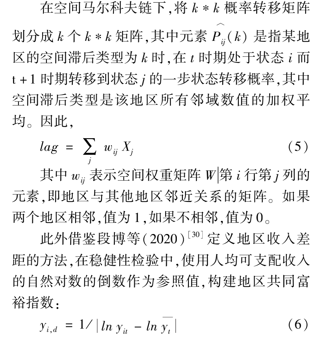 地区间共同富裕指数(CR),采用空间马尔科夫链的方法计算共同富裕指标,Markov链能很好分析系统内部的转移规律,揭示地区经济动态演变趋势,但是传统Markov链对于邻域地区的影响作用无法测量,随着经济一体化的发展,各地之间的要素流动日益频繁,一个地区的收入水平会受到另外一个地区的影响。因此,为更好地考察共同富裕程度,我们计划在空间马尔科夫链框架下,将传统马尔科夫与空间自相关相结合来构建空间马尔科夫,对于一个马尔可夫链,在给定过去的状态X0,X1,…,Xn-1和现在的状态Xn时,将来的状态Xn+1的条件分布独立于过去的状态,而只依赖于现在的状态。pij表示过程处在状态i时,下一次转移到状态j的概率。由于概率值非负且过程必须转移到某个状态,所以有
