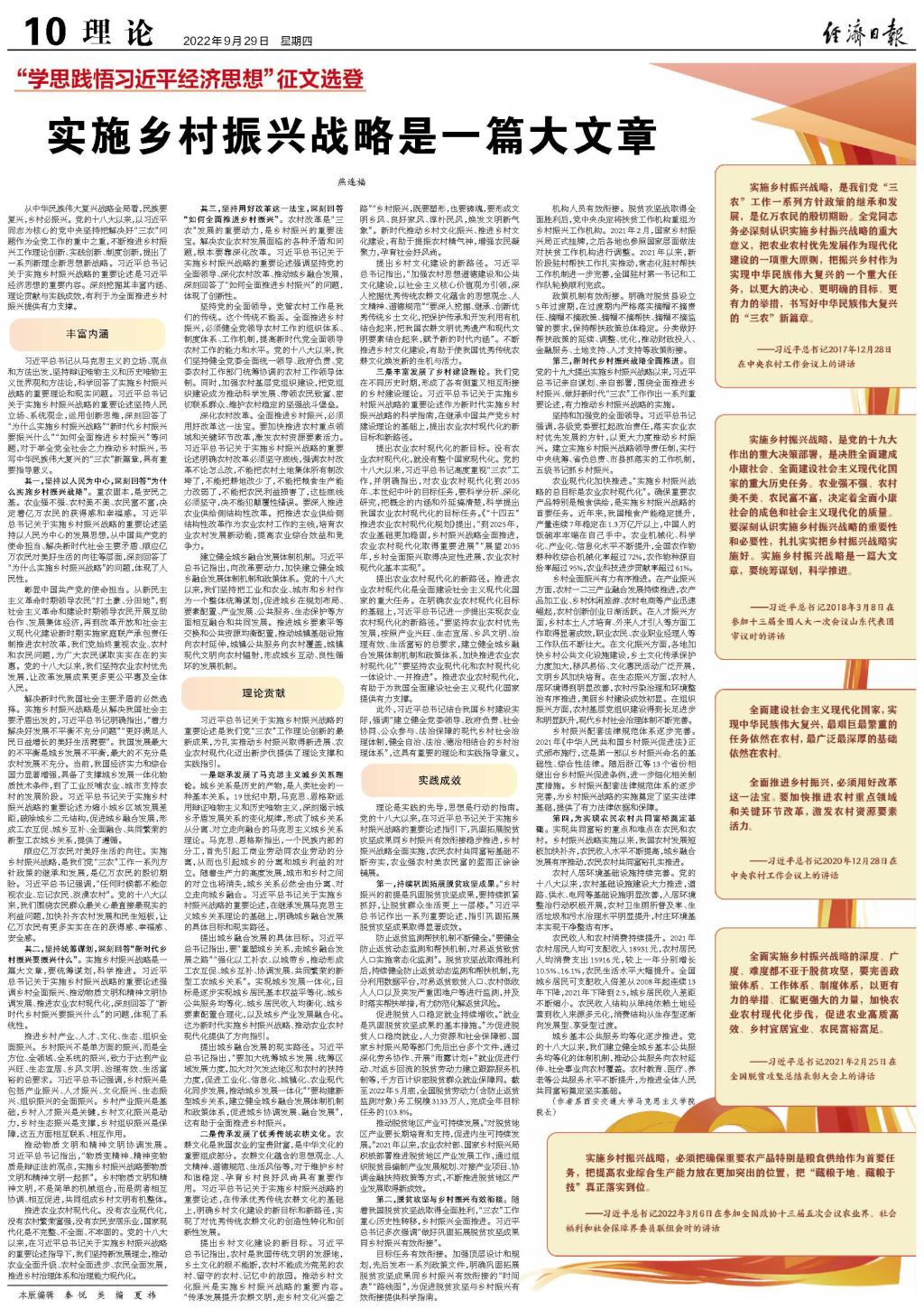 理论是实践的先导,思想是行动的指南。党的十八大以来,在习近平总书记关于实施乡村振兴战略的重要论述指引下,巩固拓展脱贫攻坚成果同乡村振兴有效衔接稳步推进,乡村振兴战略全面实施,农民农村共同富裕基础不断夯实,农业强农村美农民富的蓝图正徐徐铺展。
