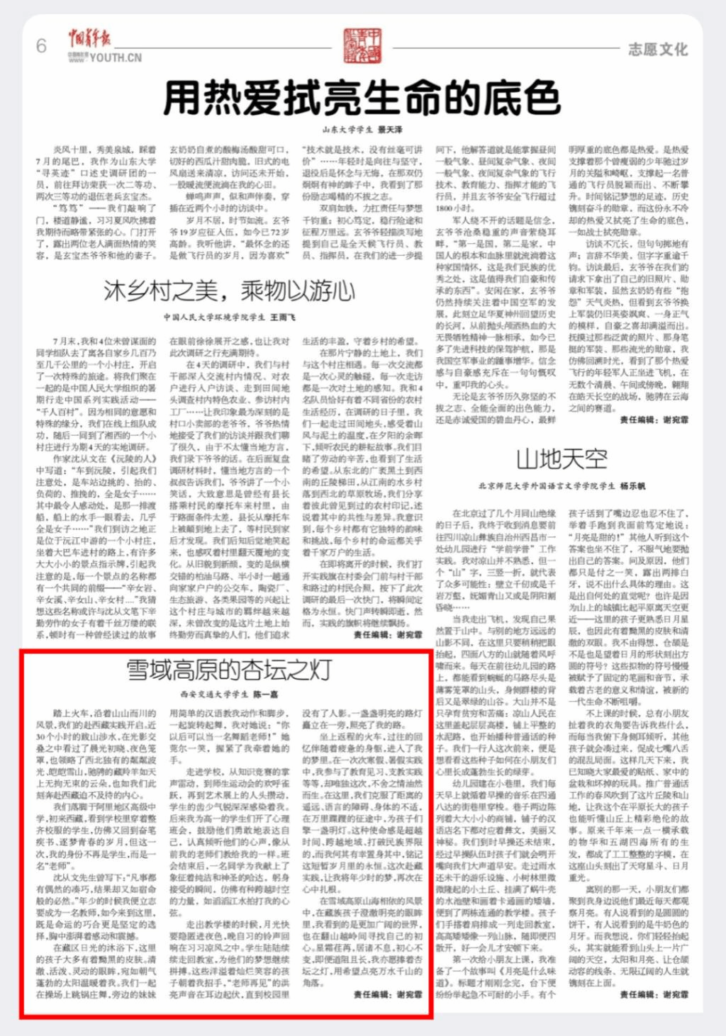 在雪域高原山海相依的风景中,在藏族孩子澄澈明亮的眼眸里,我看到的是更加广阔的世界,也在翻山越岭间寻找自己的初心。星霜荏苒,居诸不息,初心不变,即便道阻且长,我亦愿捧着杏坛之灯,用希望点亮万水千山的角落。